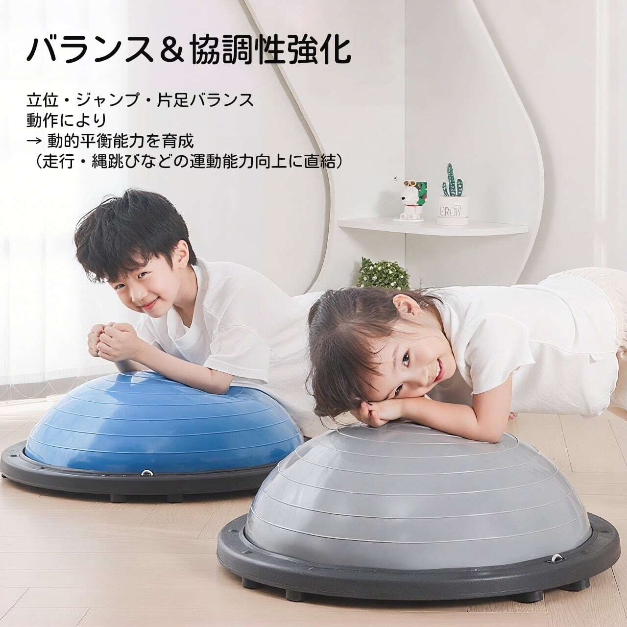 立つ・跳ぶ・片足でのバランス保持などの動作を通じて動的バランスを鍛え、走る・縄跳びなど運動能力の発達にプラス効果。
