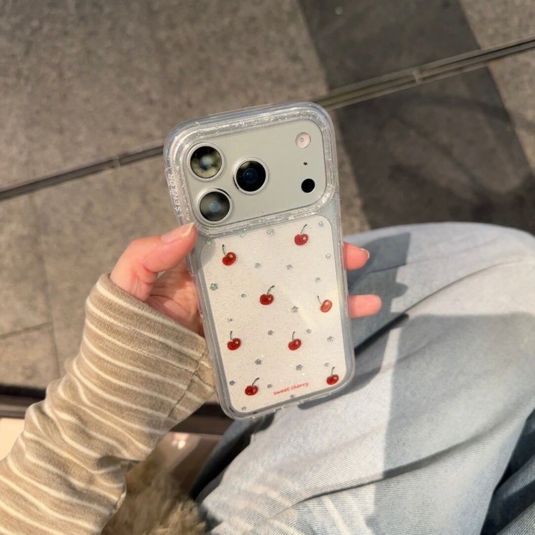キラキラ輝くゴールドと、全面に散りばめられた星とチェリーのiPhoneケース