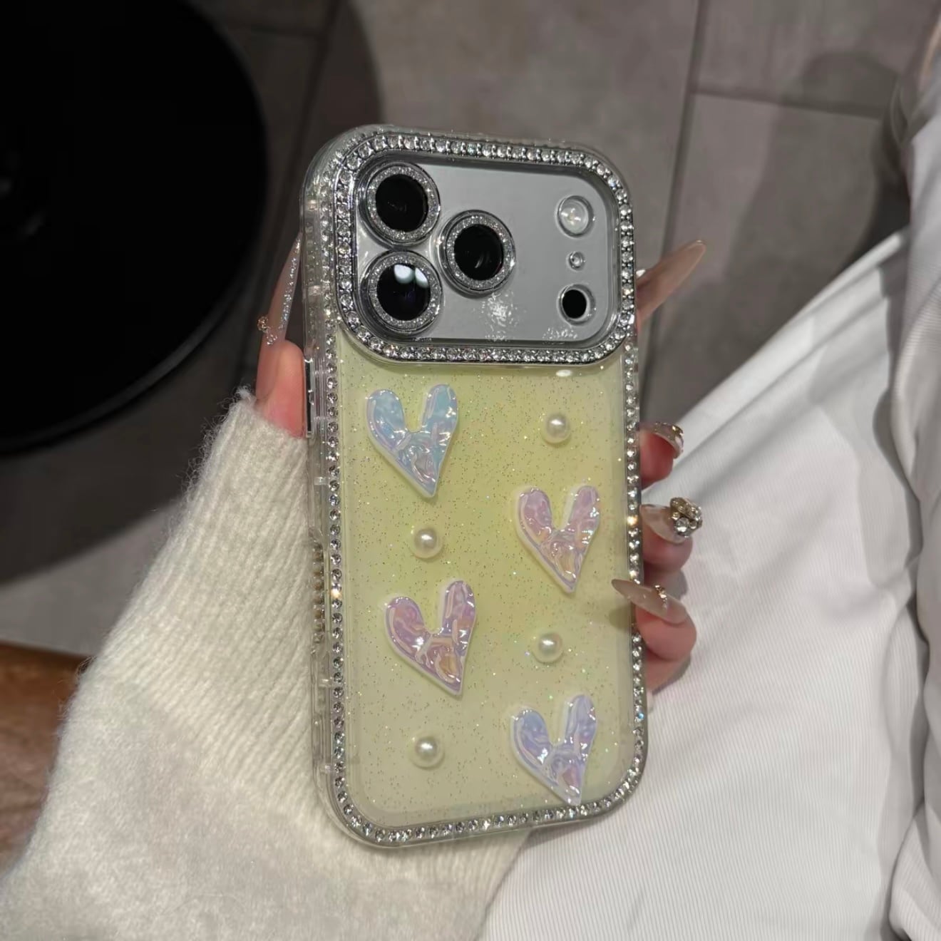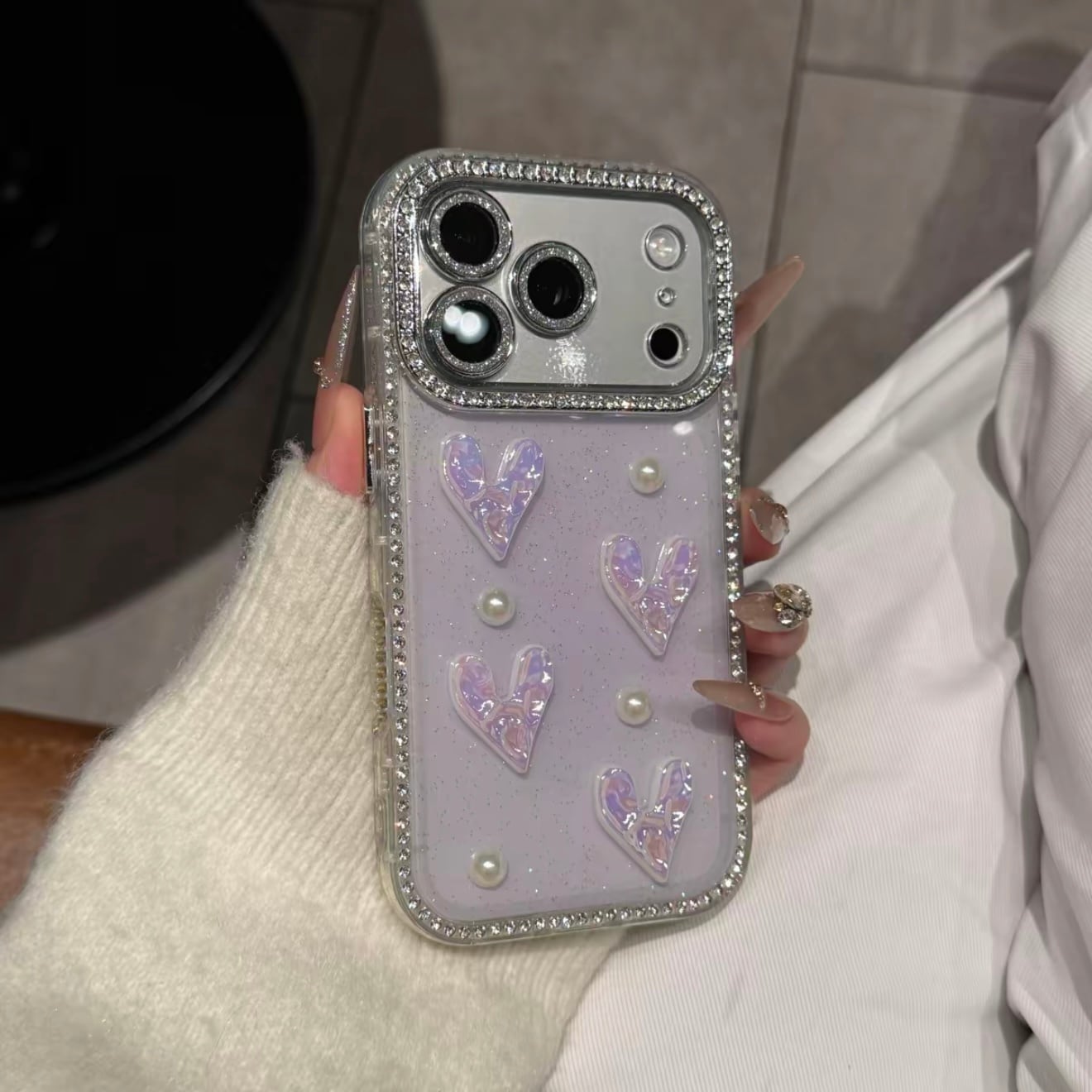 高級感と可愛らしさを兼ね備えた、ダイヤモンドがあしらわれたハート型パールのiPhoneケース