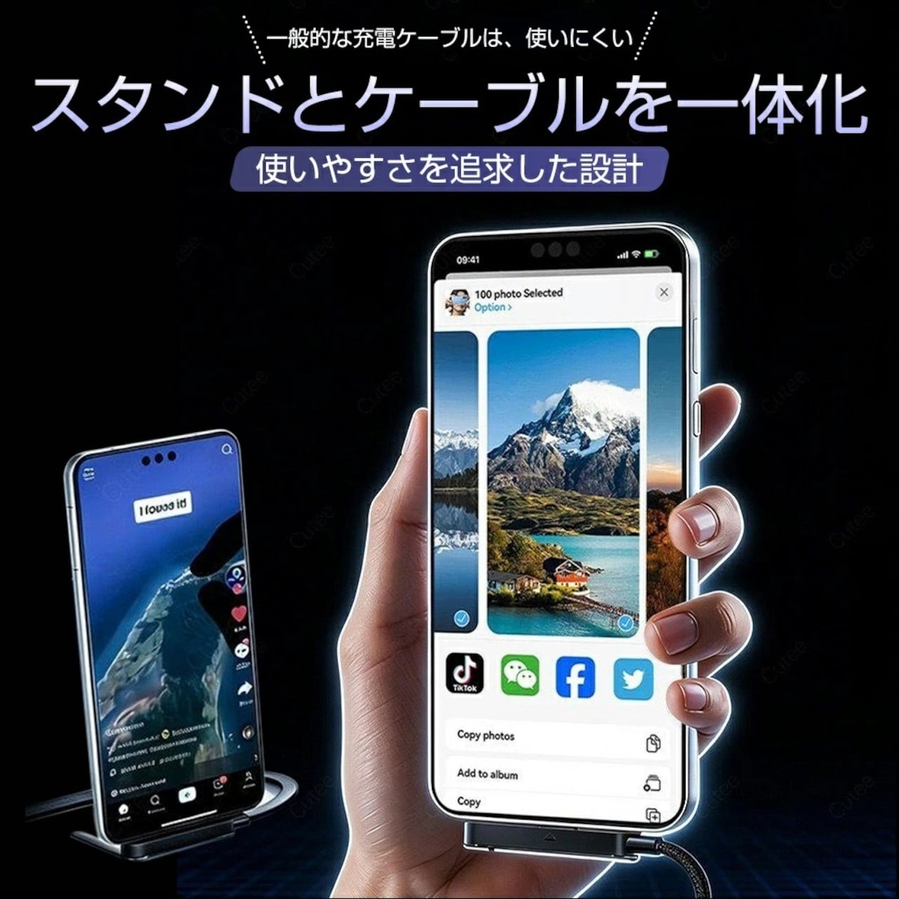 この「折りたたみスタンド付き 急速充電ケーブル」は、充電機能とスマホスタンド機能を一体化した新しいタイプのケーブルです。