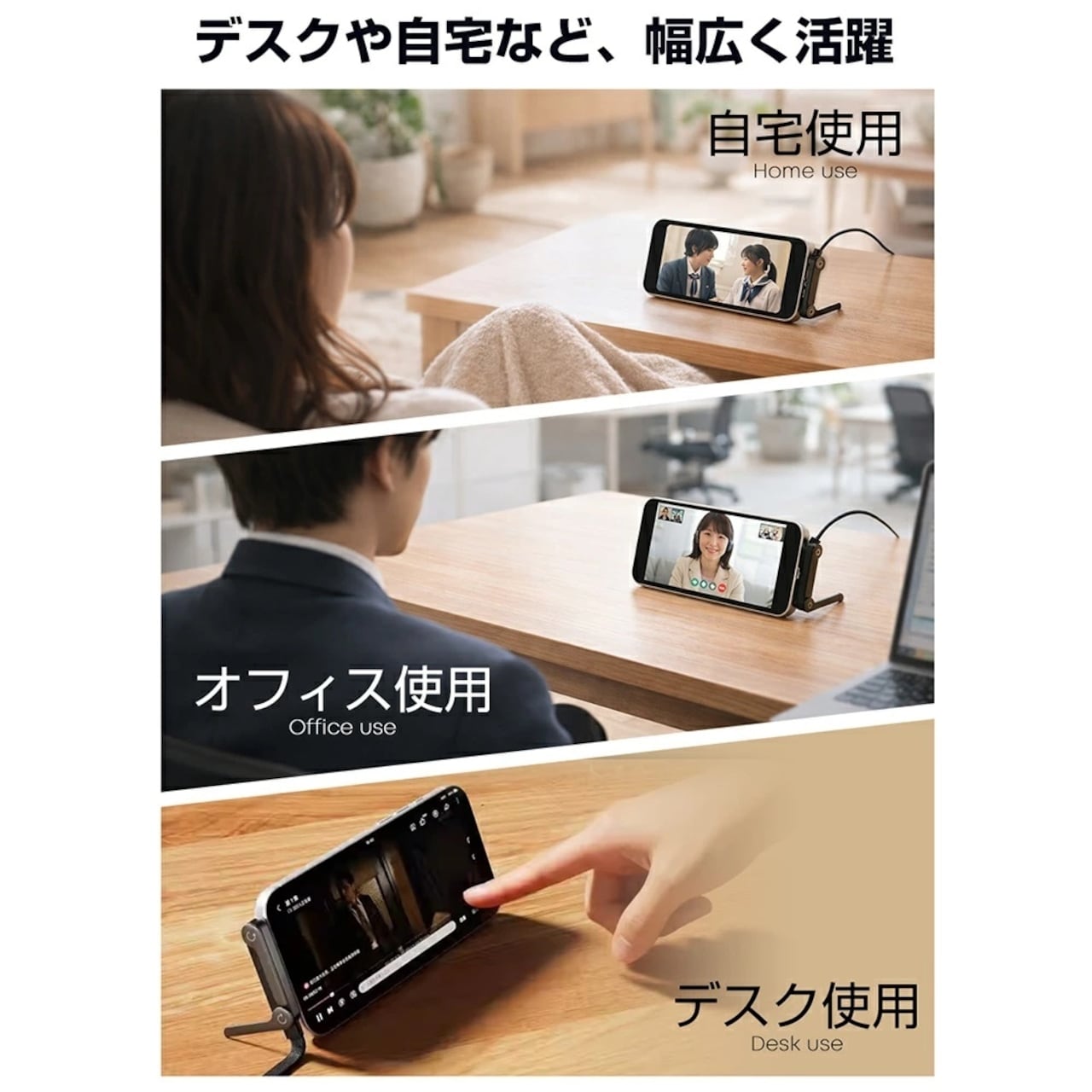 オフィスで:仕事中もスマホを立てかけ、通知を確認しながら充電