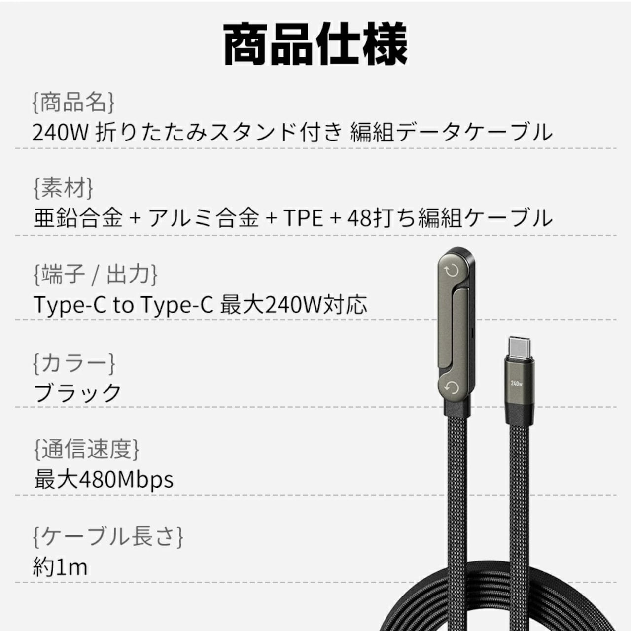 Y29. 折りたたみスタンド付き 240W 急速充電ケーブル Type-C 1m スマホスタンド 動画視聴 ゲーム 縦置き 横置き 角度調整