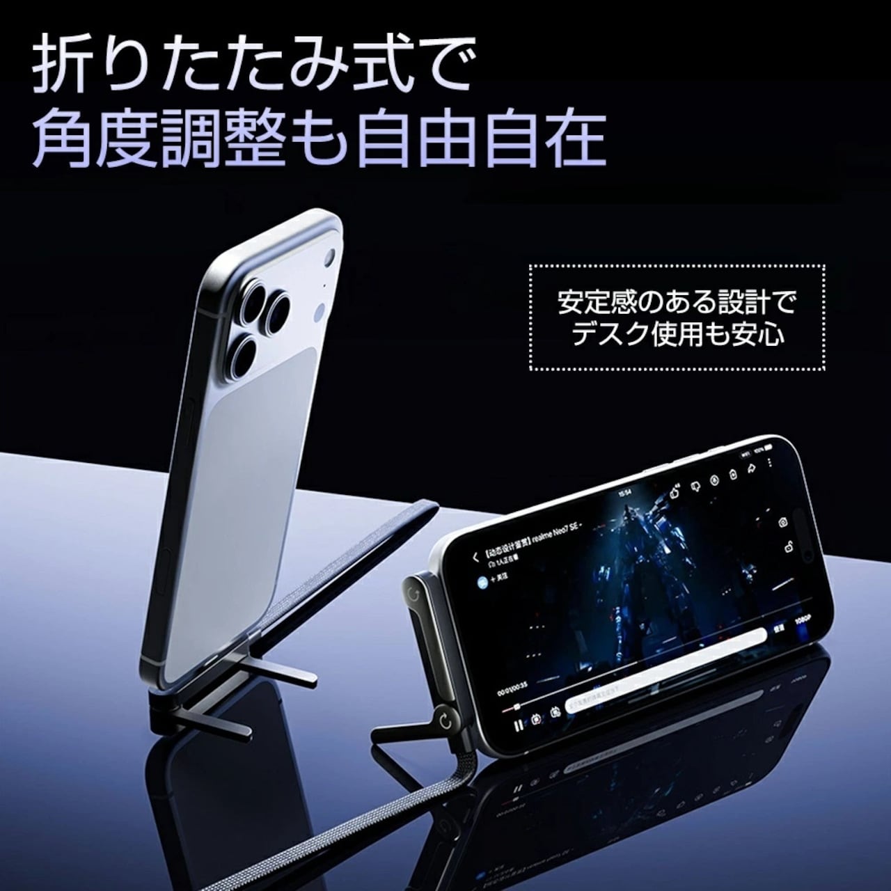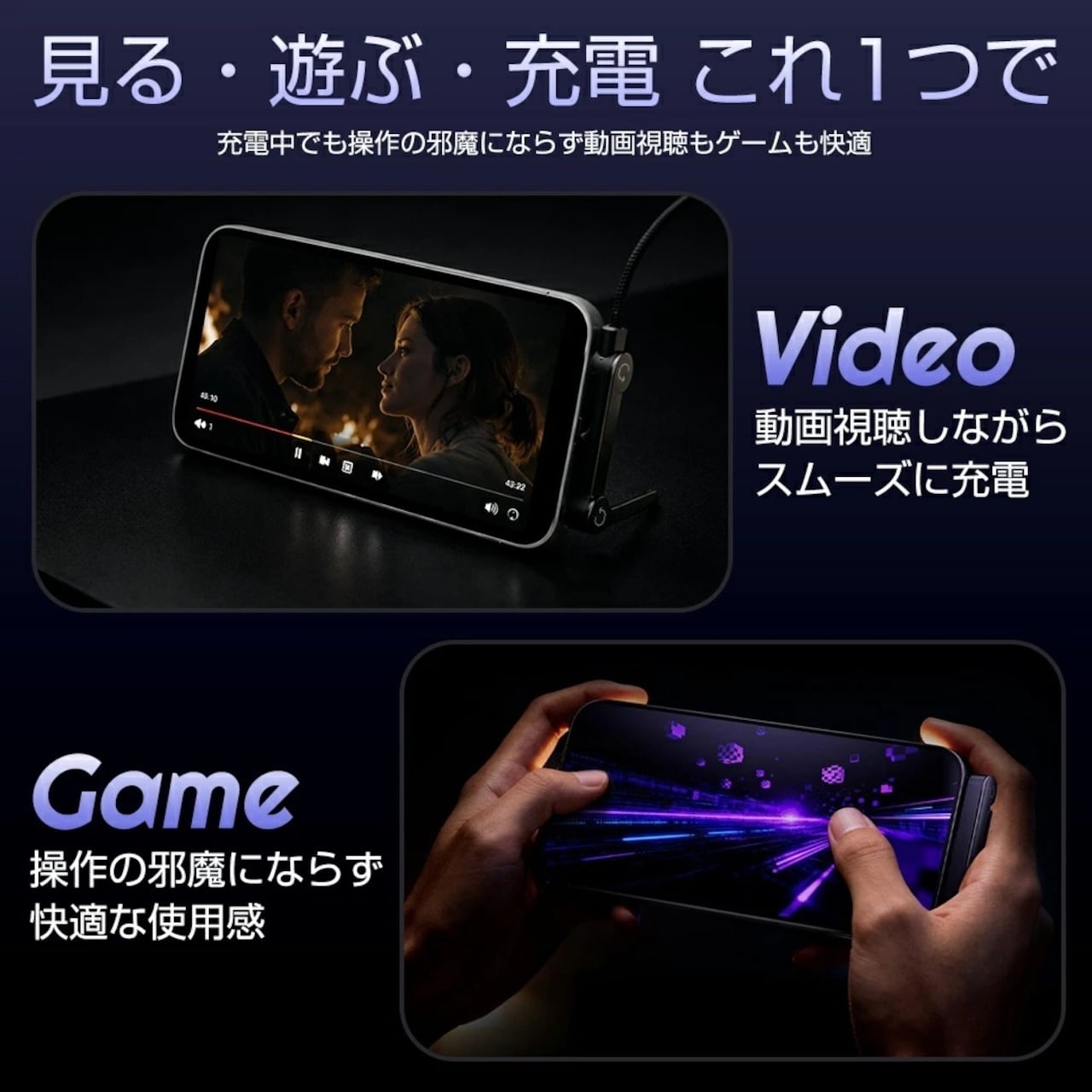 L字型コネクタと金属製折りたたみスタンドが、充電中のスマホを縦置き・横置き自由な角度で安定サポート。“見る・遊ぶ・充電する”を同時に、もっと快適に実現します。