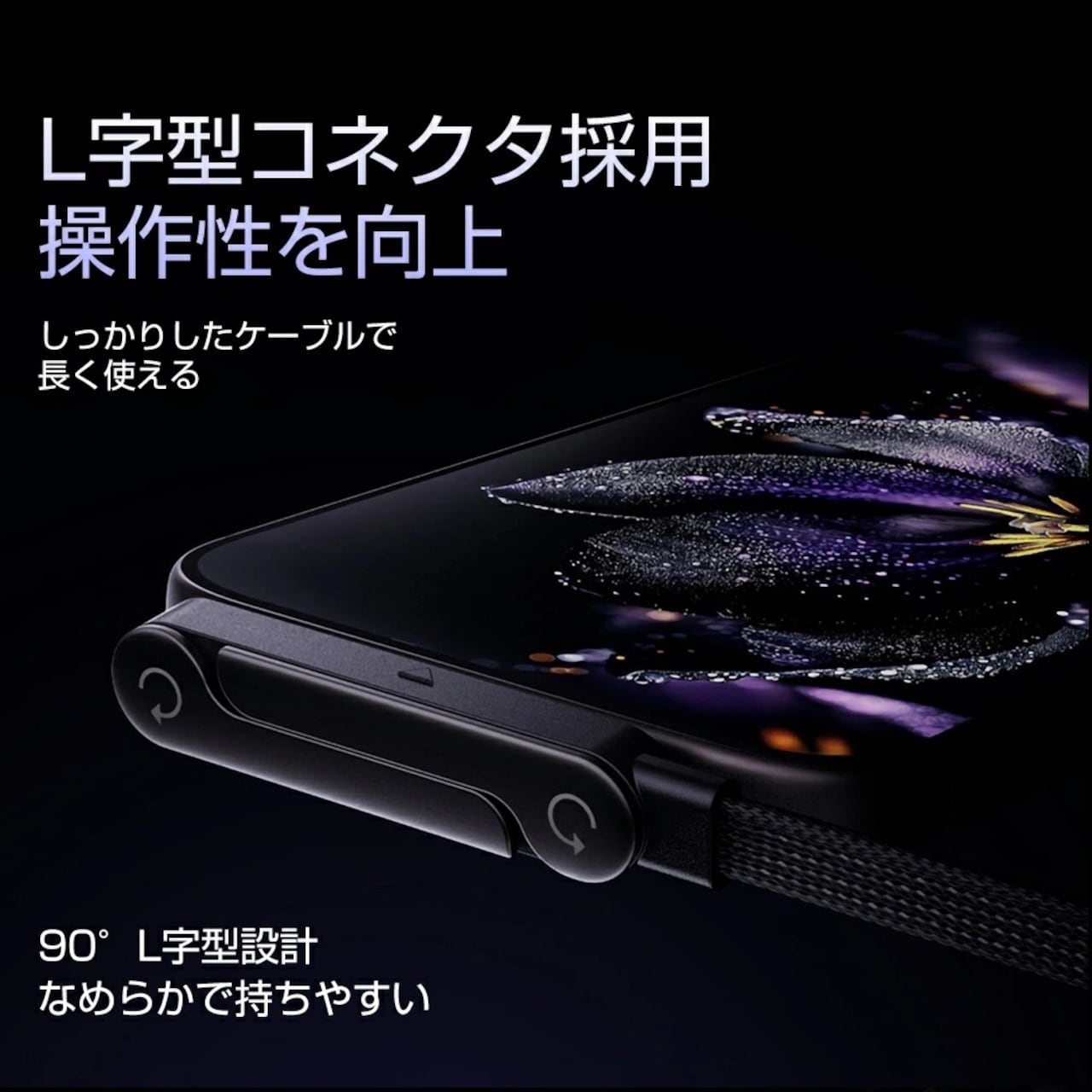 90度に曲がったL字型設計により、充電中もケーブルが手や指の邪魔になりません。動画視聴やゲームプレイ、縦向きでの操作も快適です。