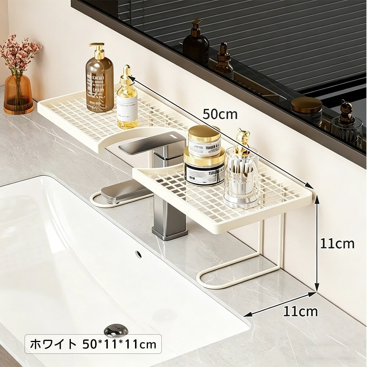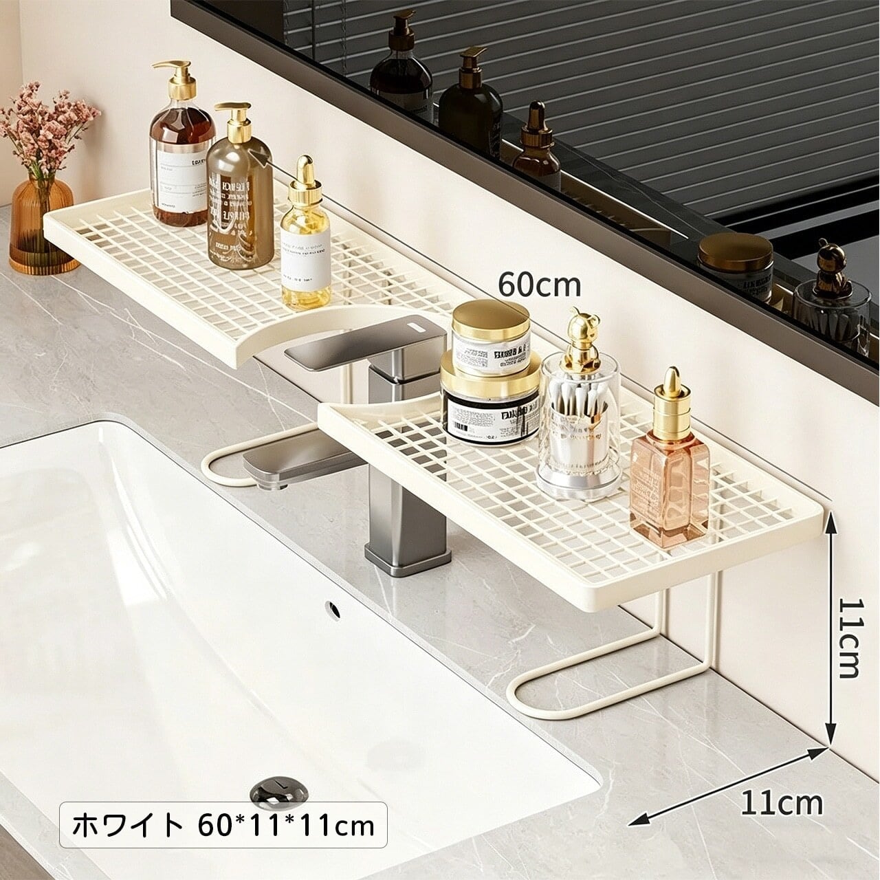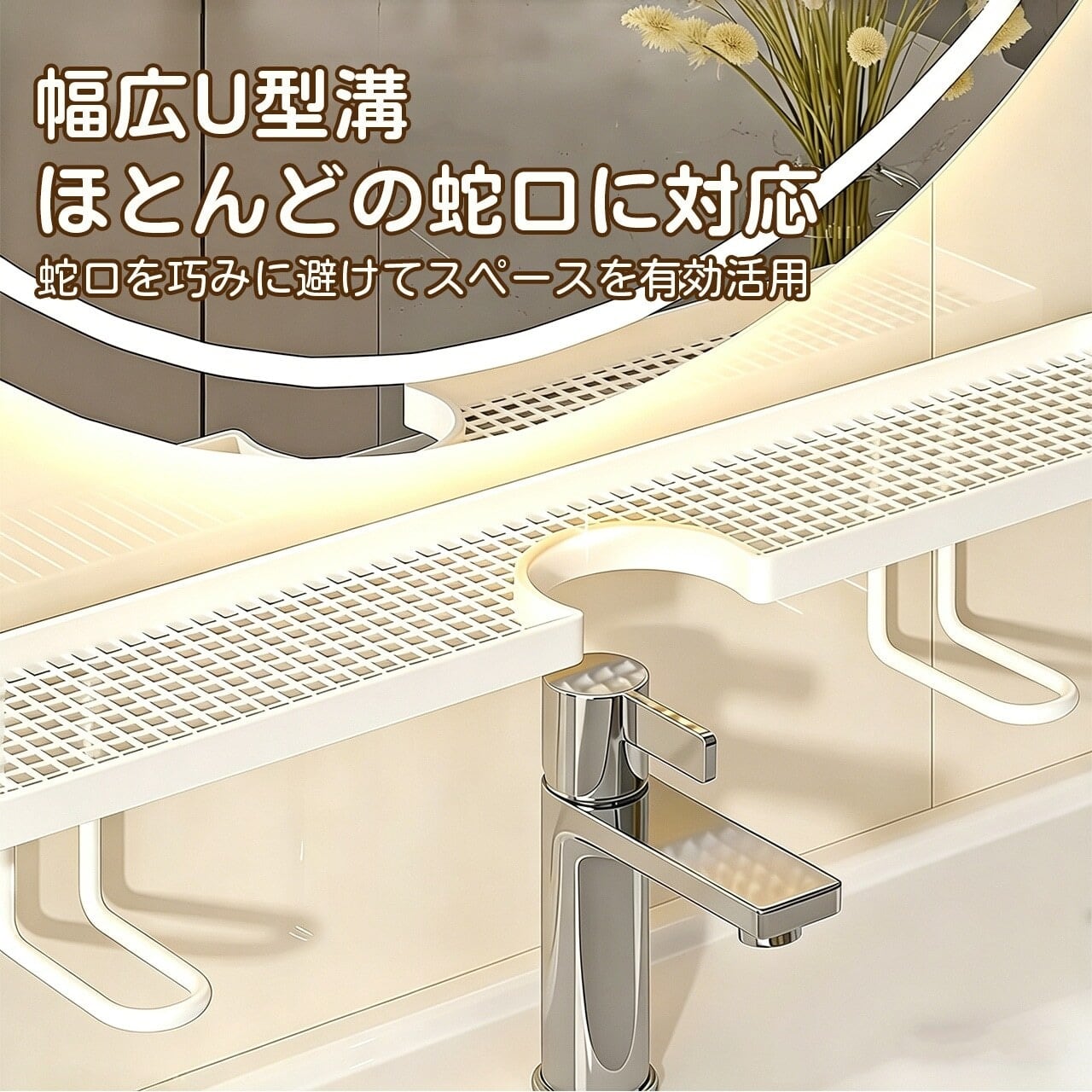 幅広のU字型溝により、重たい化粧品やスキンケア用品もしっかり保持。落下の心配なし。