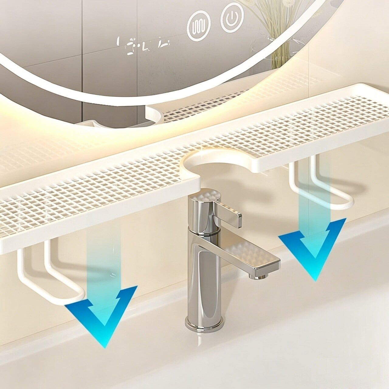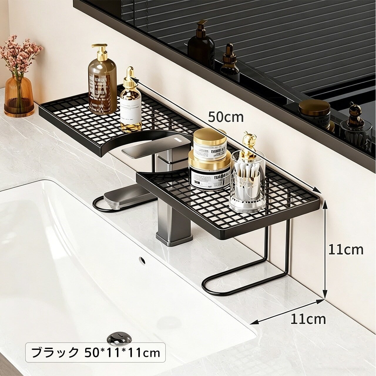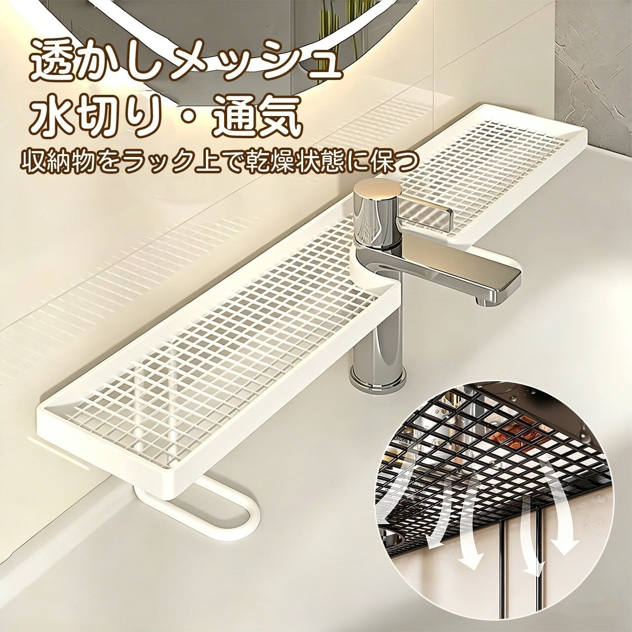 幅広のU字型溝により、重たい化粧品やスキンケア用品もしっかり保持。落下の心配なし。