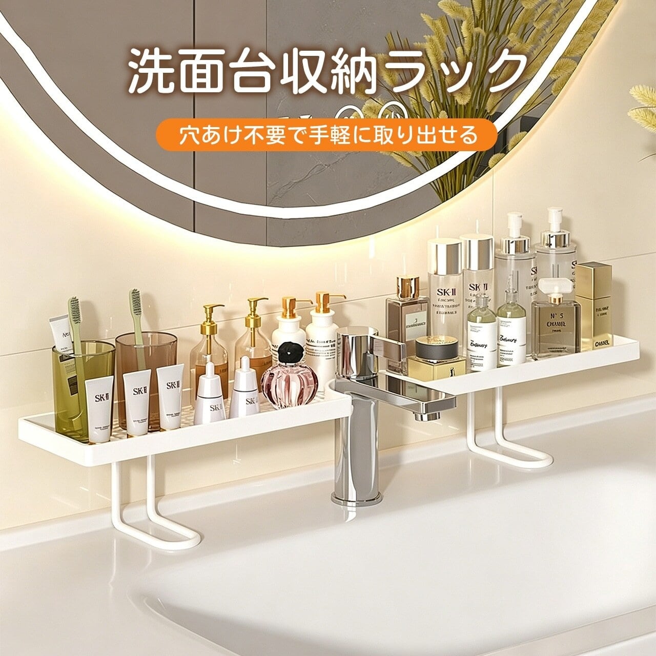 化粧品、スキンケア用品、ヘアブラシ、小物類などをスッキリ収納。洗面台まわりをすっきり整理できます。