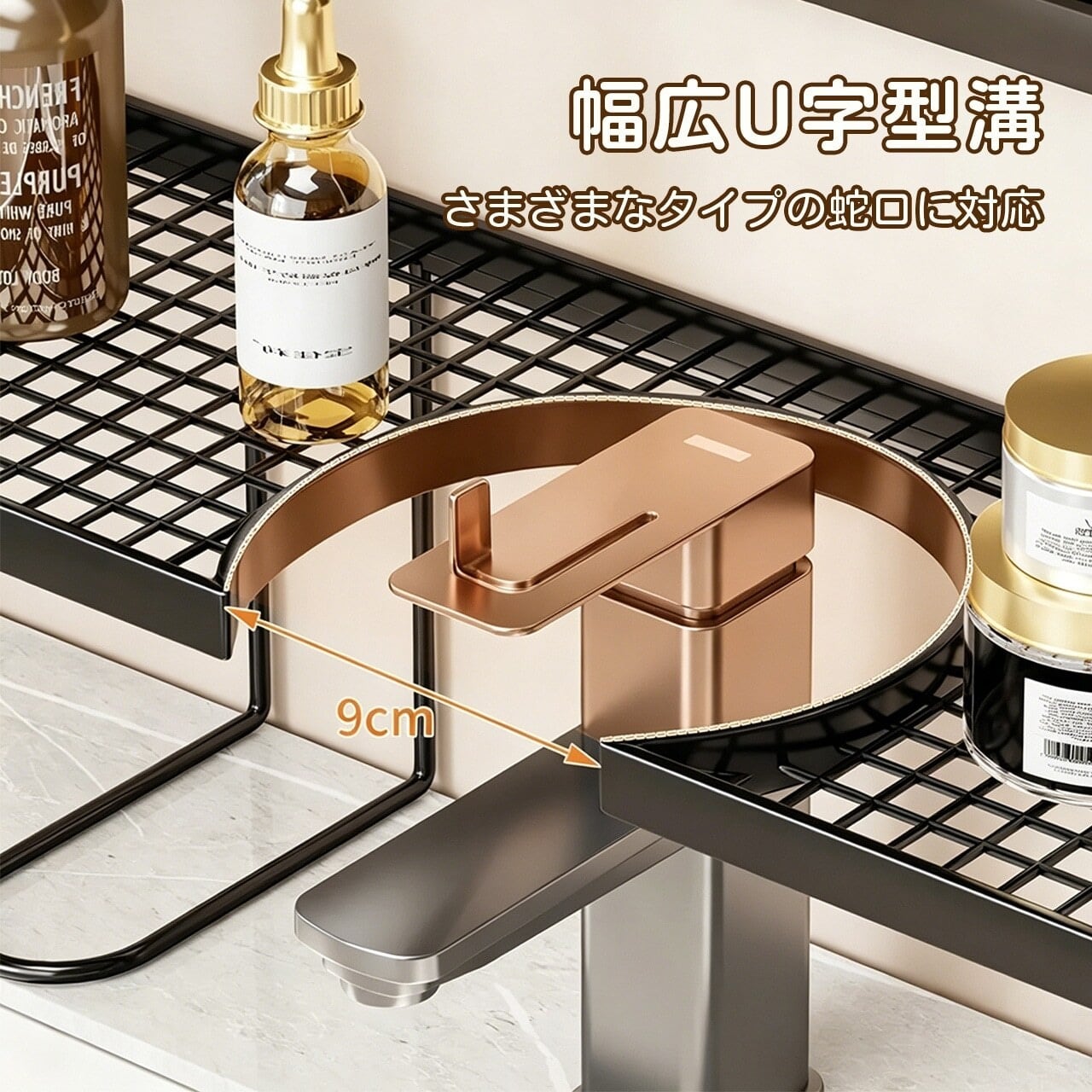 幅広U字型溝で重い化粧品やスキンケア用品も安心して収納。安定性抜群で落下しにくい設計です。