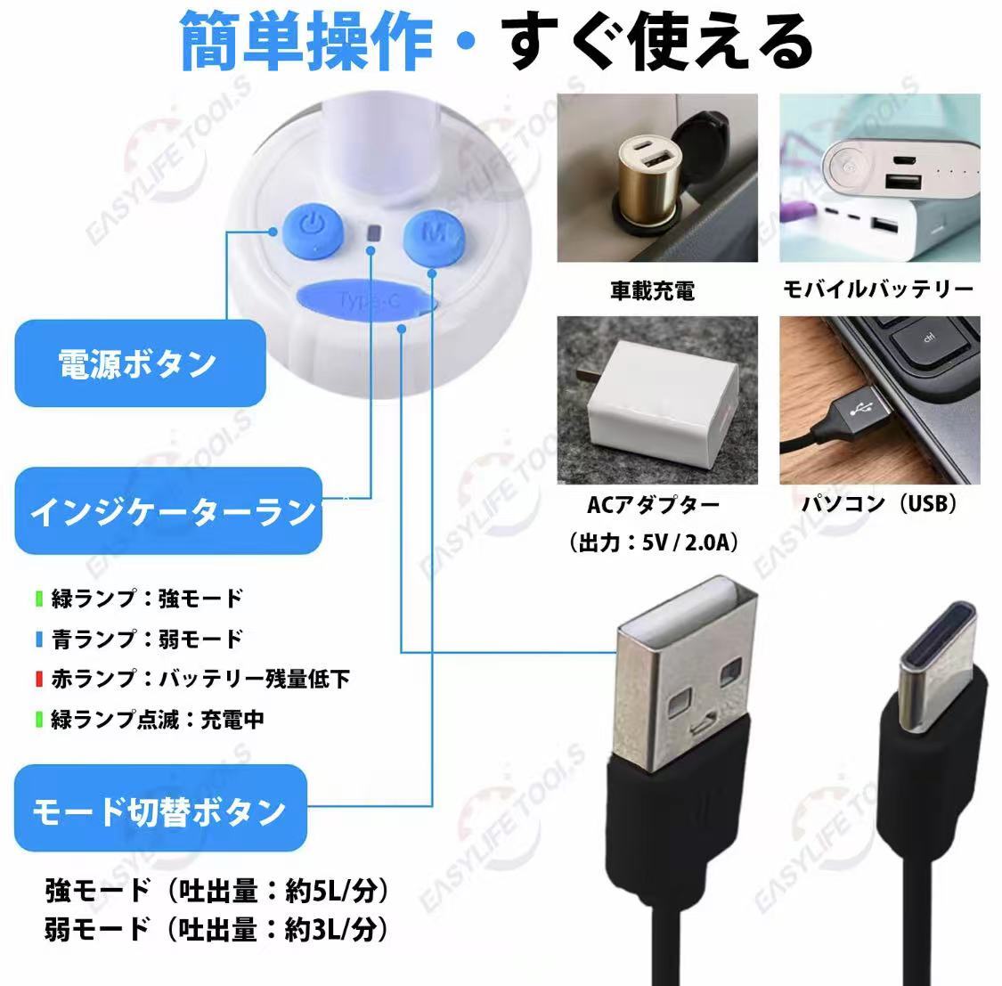 持ち運びに便利な軽量設計。約4~5時間の充電で、約60~70分連続使用可能。2~3人での使用にも対応し、キャンプ・旅行・海水浴に最適です。